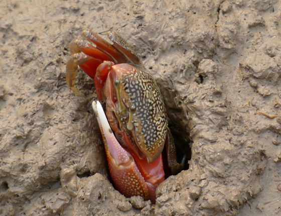 6、泥蟹 泥蟹,又称白穴。生活环境为海水,一般生活于河口或内陆海的泥滩;属沙蟹科,它的伙伴有招潮蟹,单这名字便能猜得其与潮水的关系,通常躲在泥滩上自己掘挖出的洞穴里,在退潮时才出来觅食。